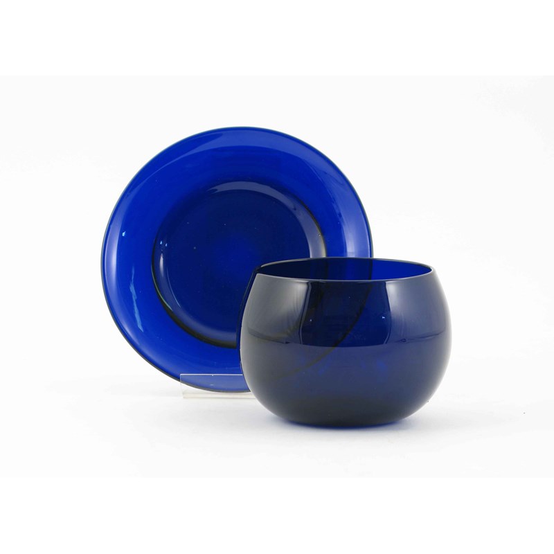 A set of six blue glass bowls and stands, elegantly rounded and a rich cobalt colour, 19th century, 18cm max. (12)