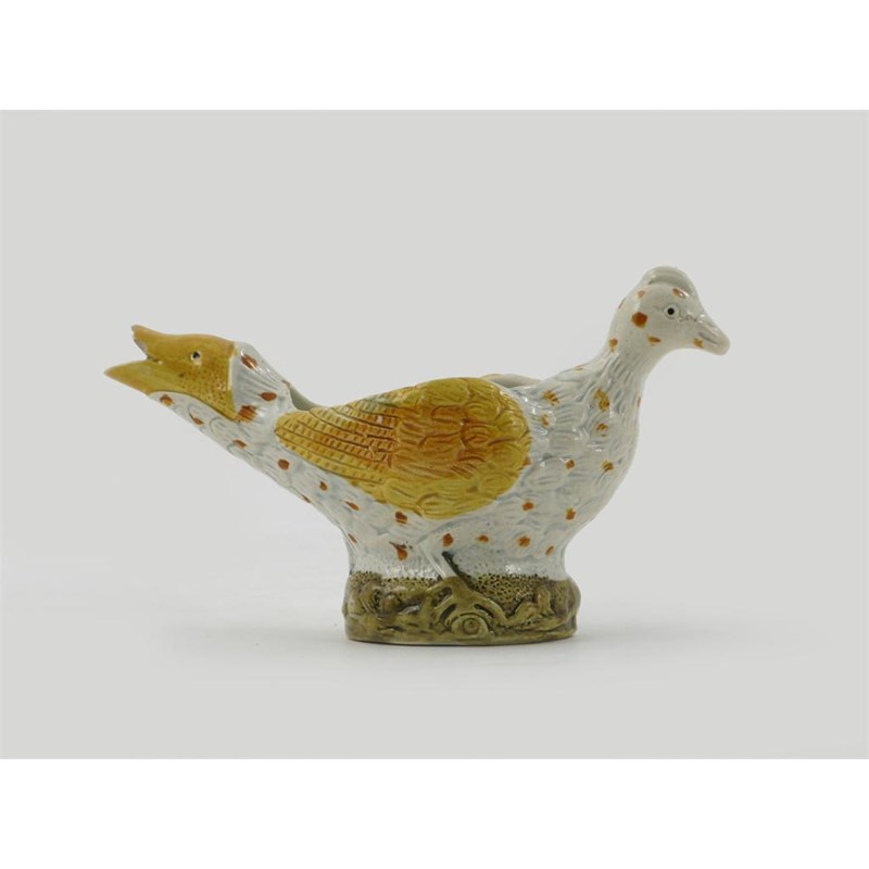 A Prattware creamer or sauceboat, 'Neither Fish Nor Fowl', modelled with the front end of a chicken, the spout as a fish's mouth, enamelled in yellow, ochre and green, late 18th century, a tiny chip to the spout, 14.5cm.