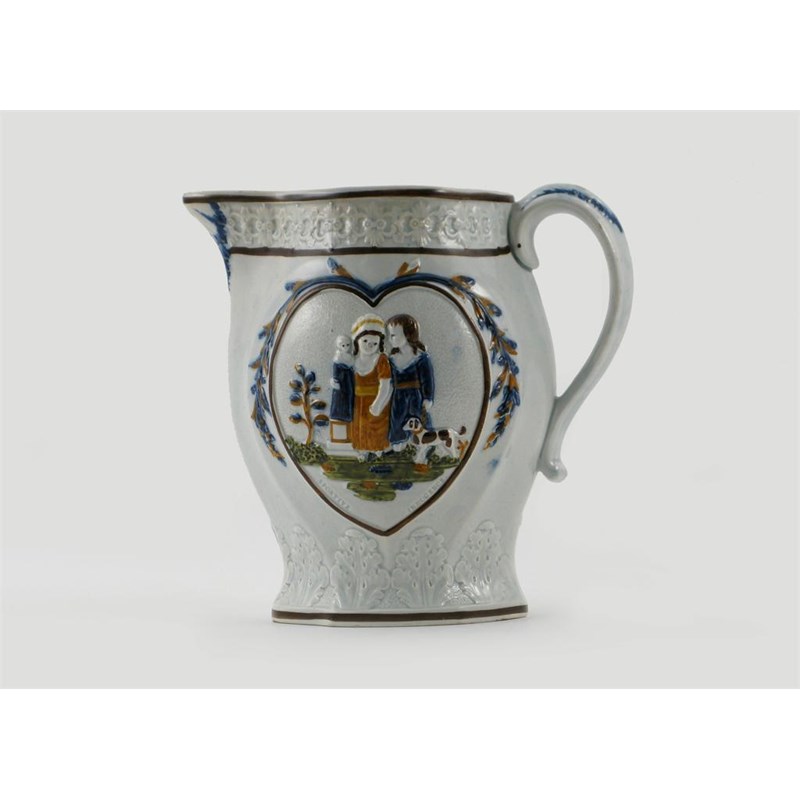 A Prattware jug, modelled with two heart-shaped panels of children at play, one titled 'Mischievous Sport', the other 'Sportive Innocence', late 18th century, a little restoration to the rim, 20cm.
