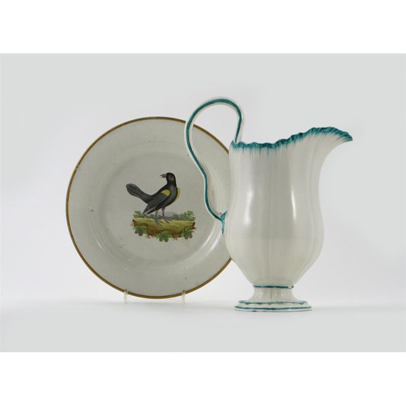 A large Wedgwood creamware jug, highlighted with turquoise enamel, impressed mark, and a creamware ornithological plate painted and titled to the reverse with a 'Yellow Winged Pye', late 18th century, a small chip to the underside of the plate, 23cm max. (2)