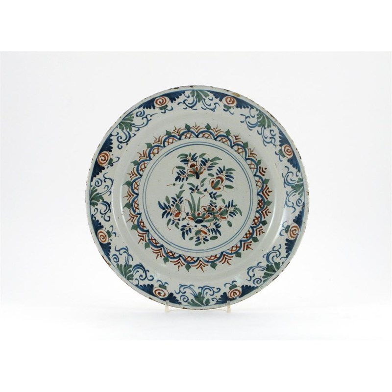 A large delftware plate, painted in blue, green and red with a central Oriental floral motif within bands of stylized foliage, 2nd half 18th century, small rim chips, 34.5cm.