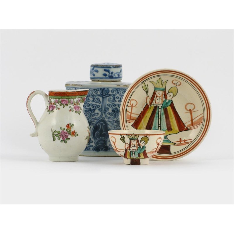 A Dutch-decorated creamware teabowl and saucer, brightly painted with the Madonna and Child, a Lowestoft jug decorated with polychrome flowers, and a Chinese blue and white tea canister and cover, all 18th century, restoration to the canister's cover, faint cracks to the creamware, 11cm max. (4)