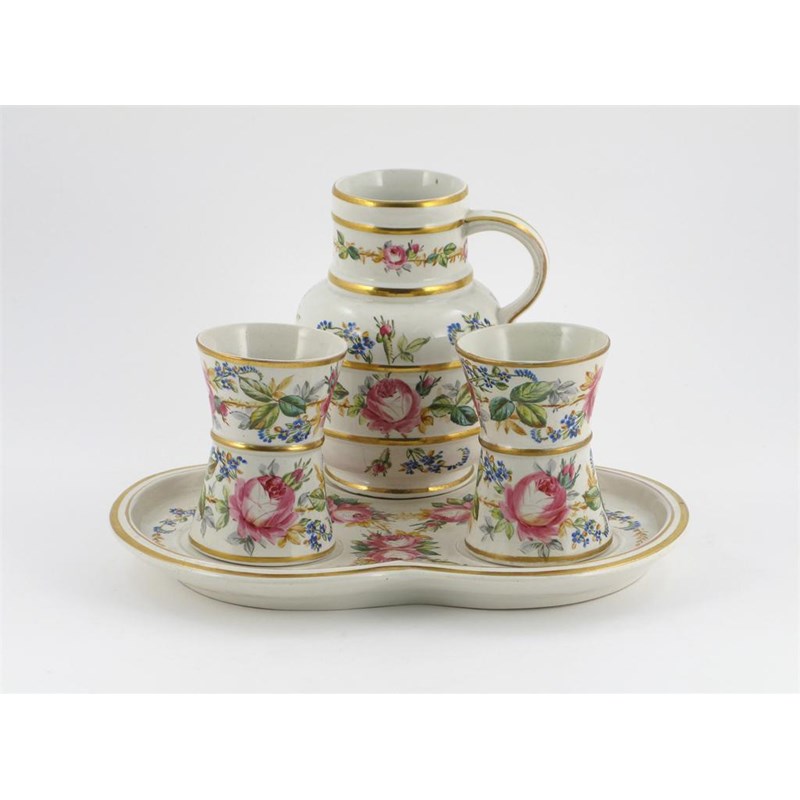 A George Jones bedroom tray, of trefoil form, with a water jug and two beakers, all painted with bands of pink roses, blue flowers and corn, impressed monogram to the base of the tray, 2nd half 19th century, some restoration, 30cm max. (4)