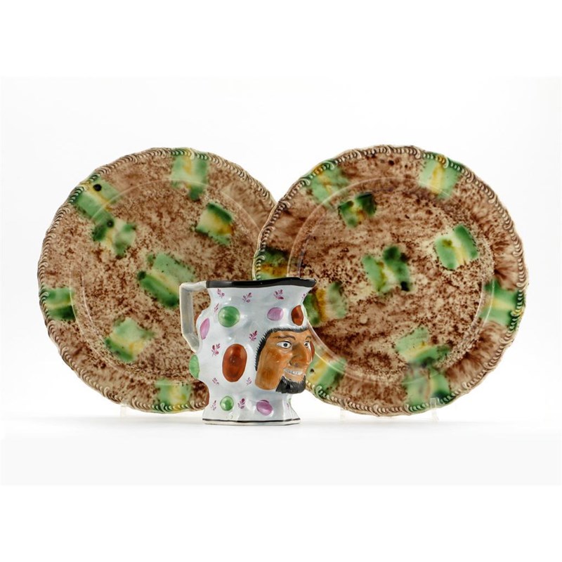 A pair of creamware plates, decorated in a Whieldon-type glaze with green and ochre dashes on a mottled brown ground, and a pearlware jester jug, moulded with a bearded face between random colourful knobbles, late 18th / early 19th century, 23.2cm max. (3)
