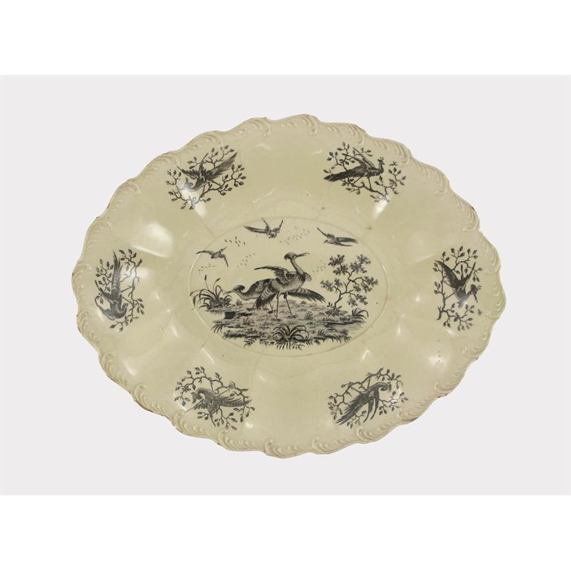 A Wedgwood creamware oval dish, with feather-moulded border, printed in black by Sadler & Green with birds in flight and standing beside water, within six vignettes of birds perched on branches, incised X to the base, c.1770, minute chipping to the rim, 30.2cm.