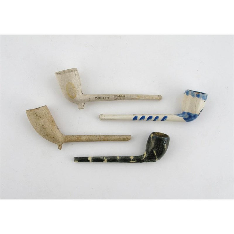 A creamware Whieldon-type pipe, decorated with splashes of a greenish black glaze, a pottery pipe painted with a blue boat in imitation of delftware, and two other clay pipes, one impressed 'Dublin', probably 19th century, minor damages, 12.5cm max. (4)
