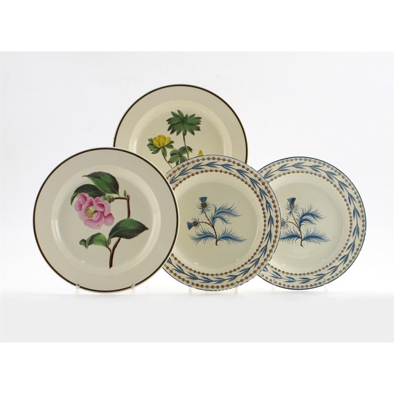 A pair of Wedgwood creamware plates, painted with botanical specimens, faint impressed marks, and a pair of Herculaneum creamware plates, decorated with flowering thistles in blue and sepia, 20.5cm. (4)