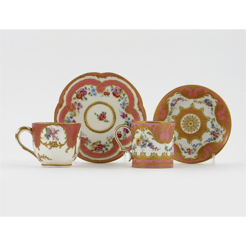Two Sèvres-style cups and saucers, painted with floral garlands and an exotic bird, each on a pink ground gilded with stylized foliage and diaper designs, 2nd half 18th century and later. (4)