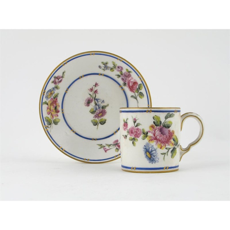A Sèvres coffee can and saucer, painted in detail with large flower sprays between blue line borders, painter's mark for Jean-Jacques Pierre le jeune, and date code for 1791, small footrim chips, 12.5cm. (4)