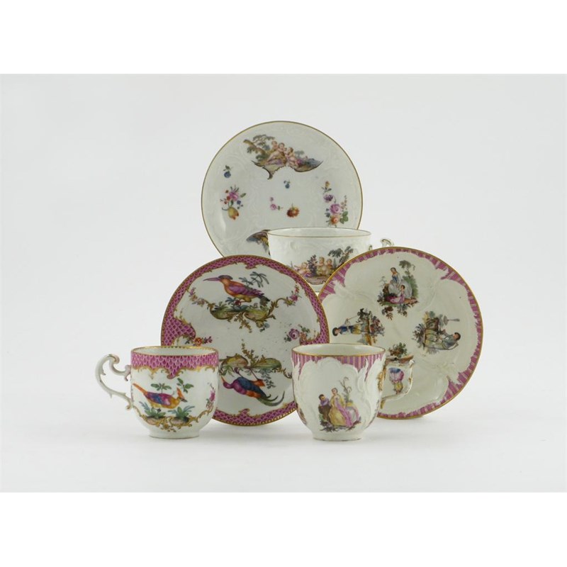 Two Meissen cups and saucers, one rococo-moulded and painted with panels of putti and flowers, the other brightly painted with colourful birds on a pink scale border, and a Berlin cup and saucer, painted with figures at various pursuits, blue crossed swords and sceptre marks, mid 18th century, 14cm. (6)