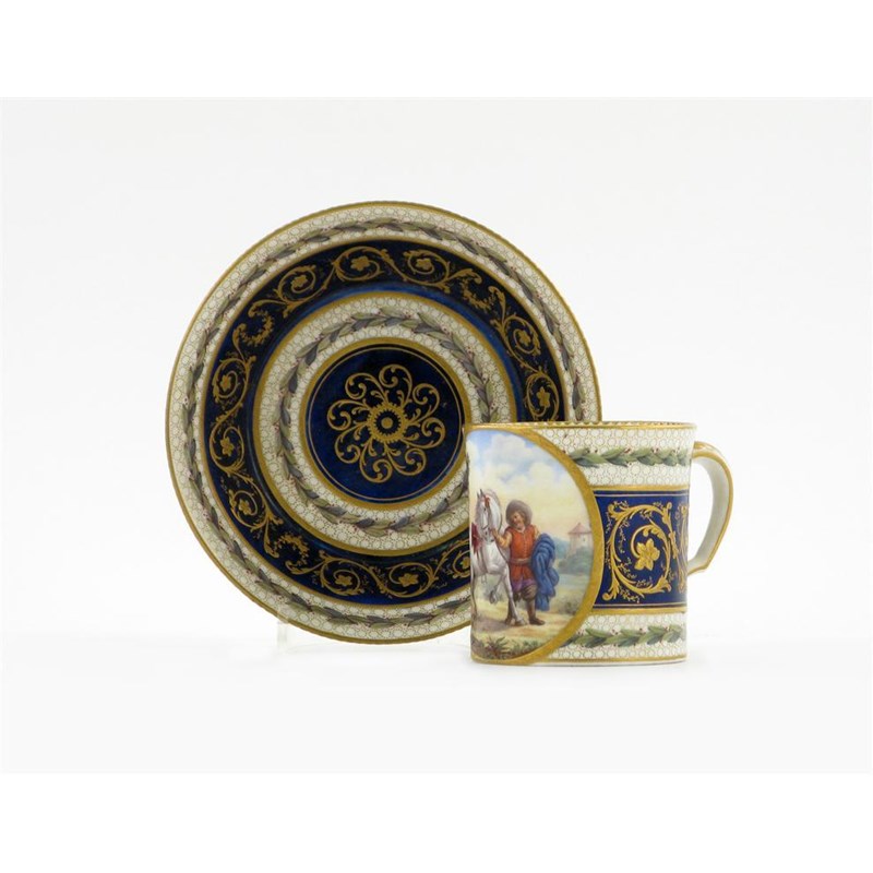 A Sèvres-style large coffee can and saucer, painted with a man in long boots, leading a shying white horse and carrying a bundle of bright blue cloth, a broad border of raised gilt foliage on a cobalt blue ground within bands of berried leaf garlands, interlaced Ls mark and painter's mark, 14.6cm. (2)