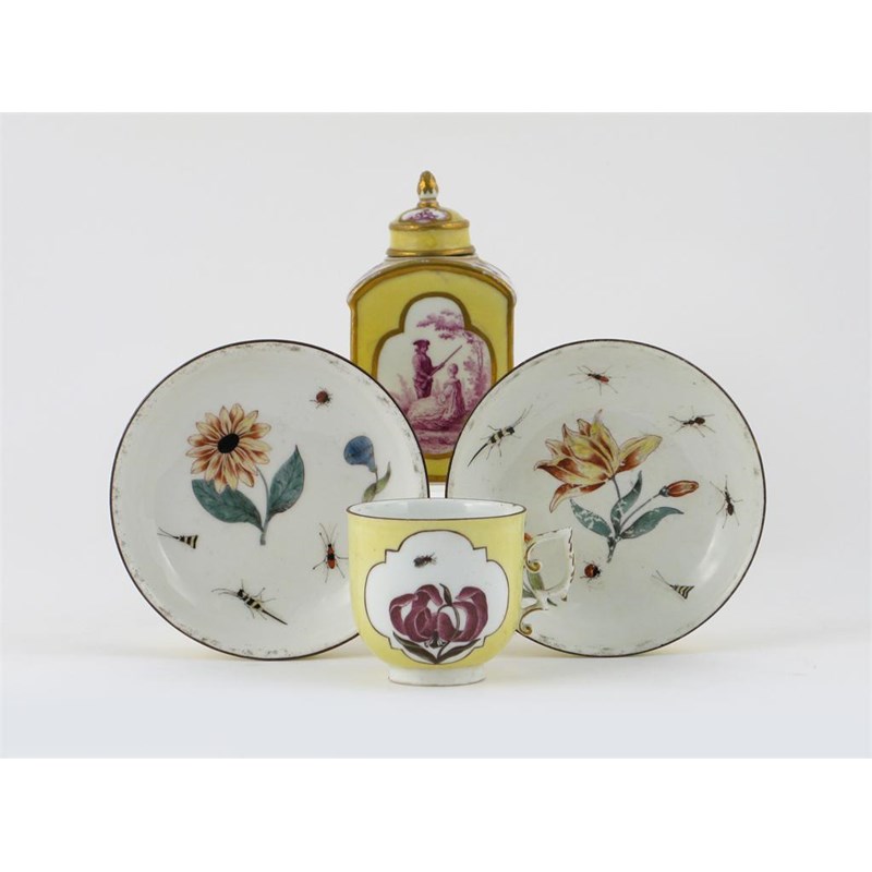 A Meissen cup and two saucers, painted with insects and ladybirds above and around botanical floral specimens on a pale yellow ground, and a similar tea canister and cover painted with puce figures, blue crossed swords marks, 2nd half 18th century, some damages and peppering, 13.5cm. (5)