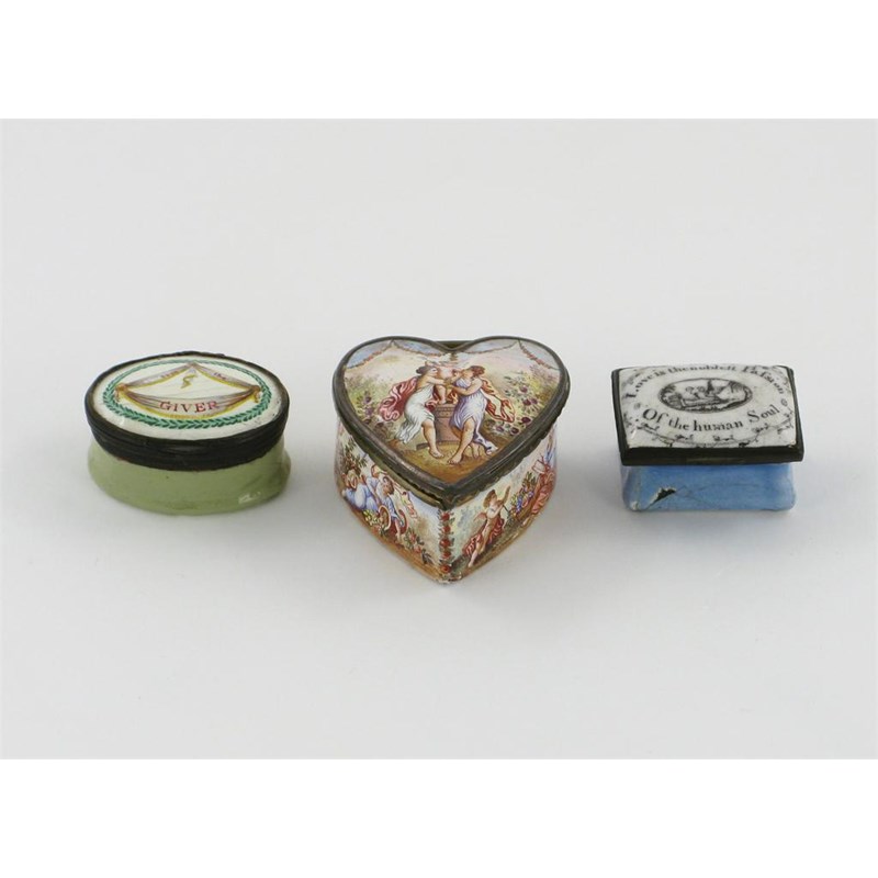 Three enamel patch boxes, one heart-shaped and painted with Classical maidens and gods at various pursuits, one titled 'Love is the noblest Passion Of the human Soul', an enamel scent bottle decorated with a young girl and a lamb, and two small porcelain boxes, 18th century and later, some damages and restoration, 6.5cm max. (6)