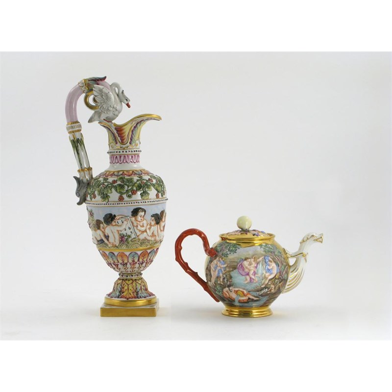 A Doccia-style teapot and cover, moulded and brightly painted with maidens bathing and couples cavorting in a stream, and a similar ewer, moulded with putti emblematic of the Arts, Science, Maths and Geography, 19th / 20th century, 30cm max. (3)