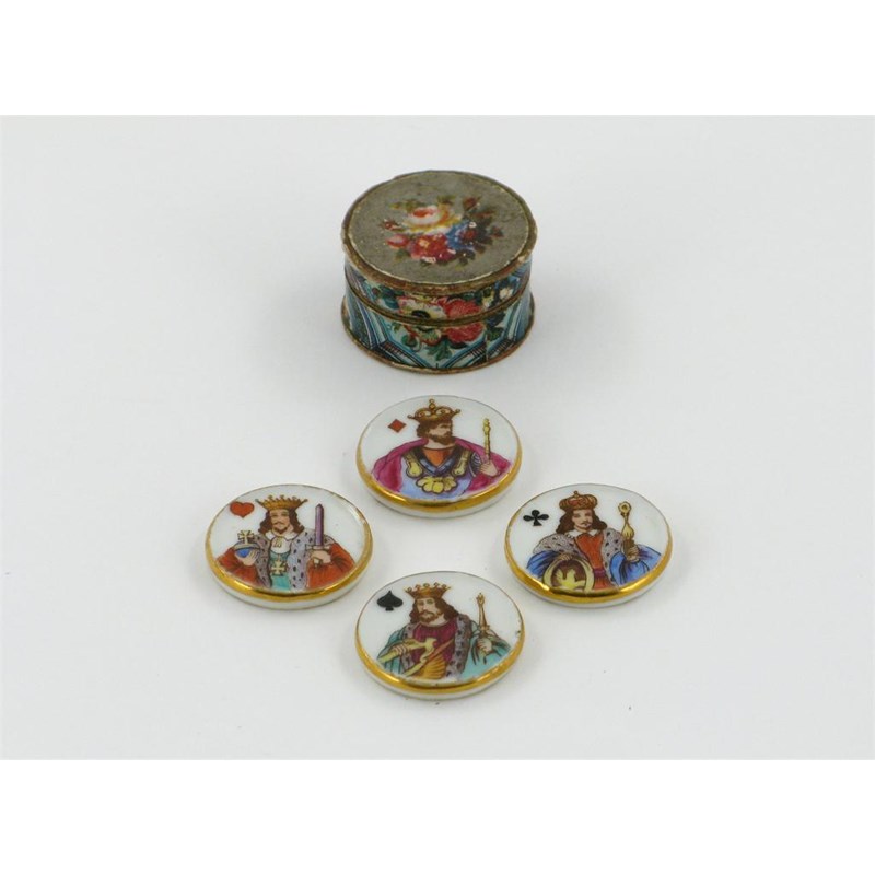 A set of four porcelain playing counters, each painted with a king from one of the four suits, 'Single', 'Double', 'Triple' or 'Quadruple' to the reverse, 2.7cm. In a small card box and cover. (6)