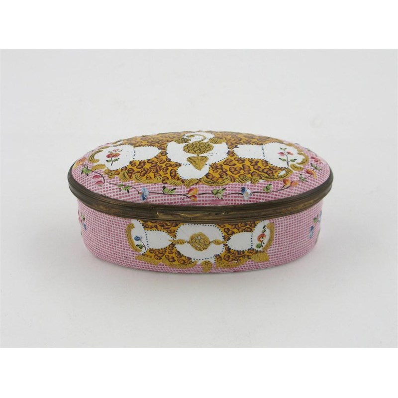 A Bilston enamel oval snuff box, decorated with polychrome flowers and gilt leaves on a pink diaper ground, with metal mounted hinged lid, late 18th century, a star crack and small chip to the interior, 9cm.
