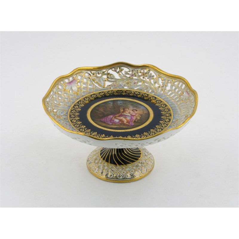 A Vienna-style tazza, painted with Venus and two sleeping cupids in a wooded grove, within a floral reticulated rim, blue shield mark to the base, titled, 19th century, cracked, 22.2cm.