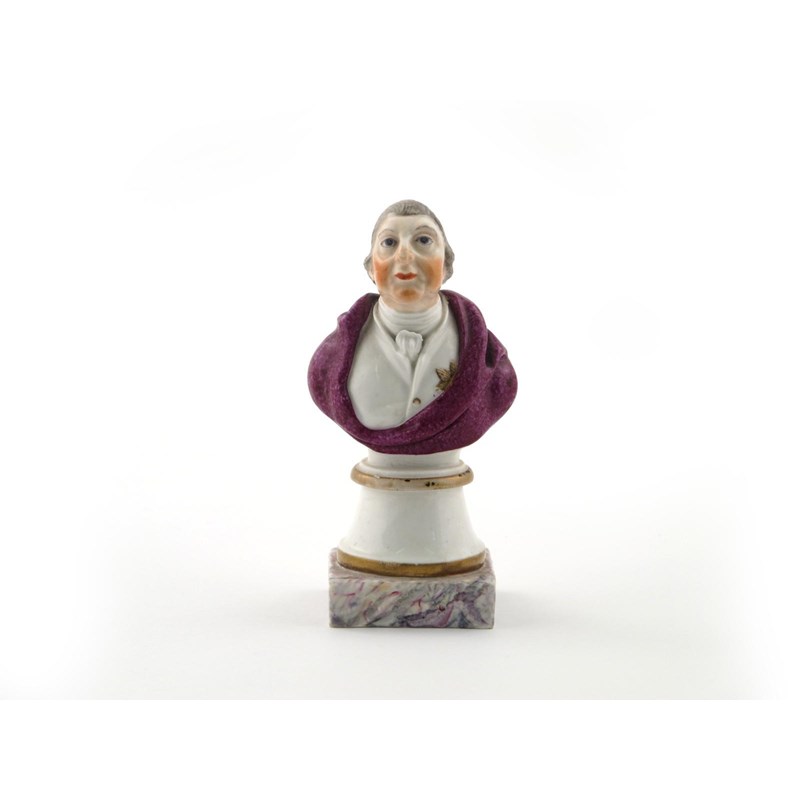 An English porcelain bust of George III 1st half 19th century, wearing a purple cloak and raised on a socle base, incised title to the reverse, 14cm.