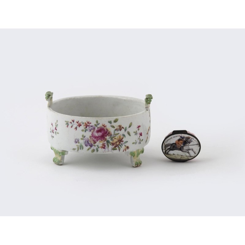 An oval enamel patch box 18th century, painted with an equestrian warrior and titled 'Cossack Mode of Attack', the base pale pink, and a Derby cylindrical butter tub decorated with birds, some damages, 12cm max. (2)