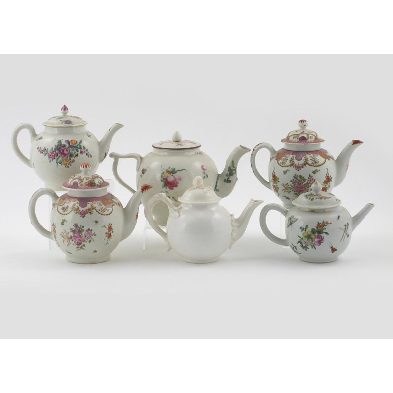 Four English porcelain teapots and covers 2nd half 18th century, two of them Lowestoft painted with flower garlands and diaper bands, a Chinese London-decorated teapot, and a white-glazed bone china teapot, some damages and restoration, 24cm max. (12)