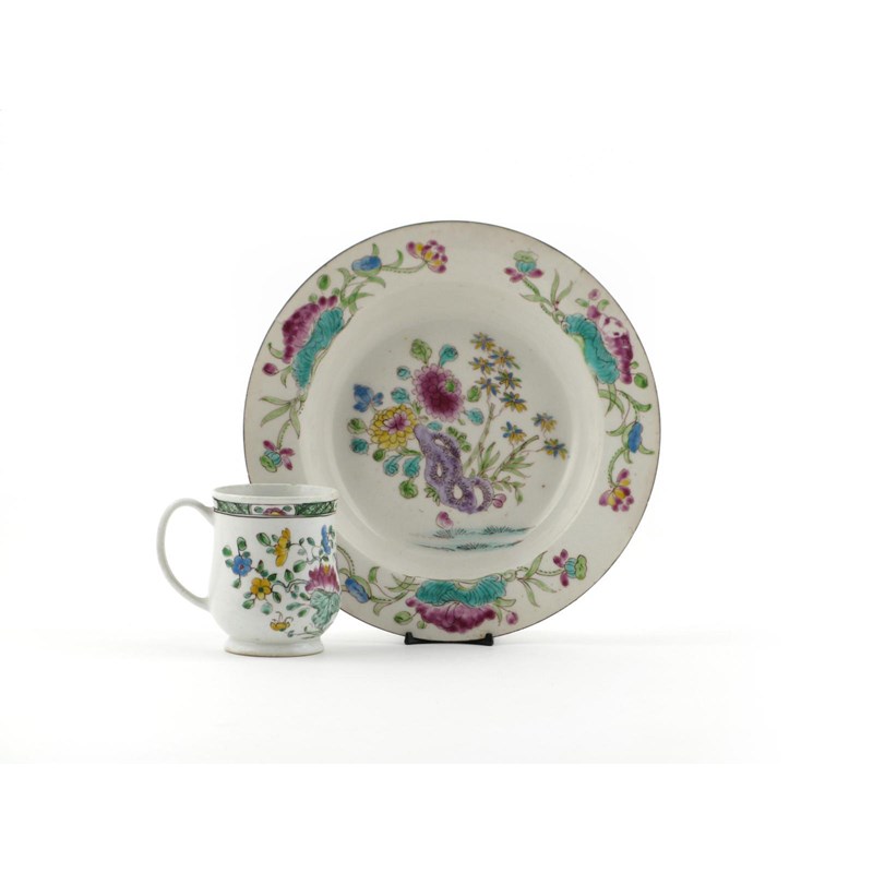 A Bow soup plate and a bell-shaped mug c.1755, painted with chrysanthemum and other Oriental flowers issuing from rockwork, the mug with a rim chip, 23.2cm max. (2)