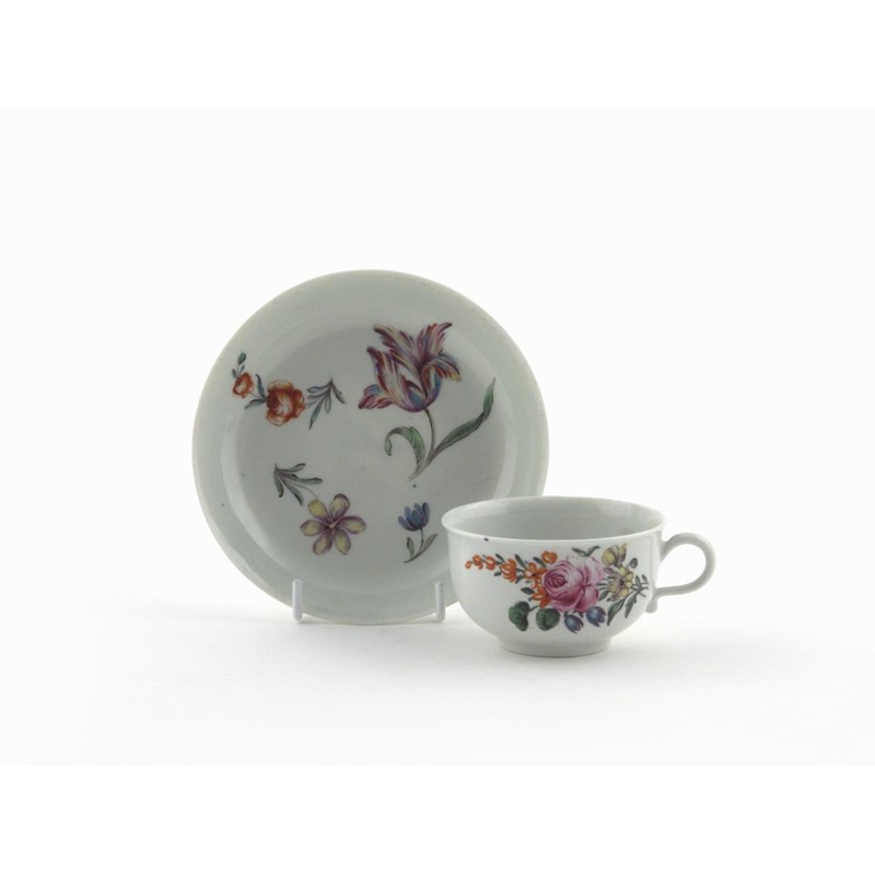 A good Worcester tea cup and saucer c.1757-60, the shape after Meissen, finely painted with flowers, the saucer with a fine blown tulip, blue crossed swords and 9 mark, 12.8cm. (2)