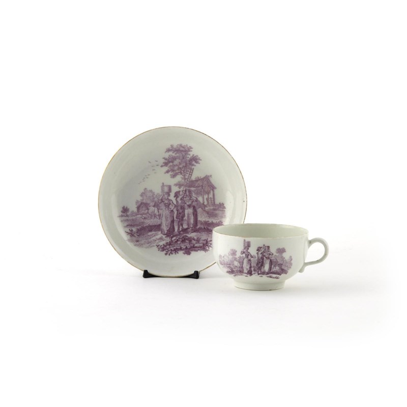A Worcester teacup and saucer c.1770, printed in purple with The Milkmaids pattern, the cup's interior with a swan, blue crossed swords marks, 13cm.