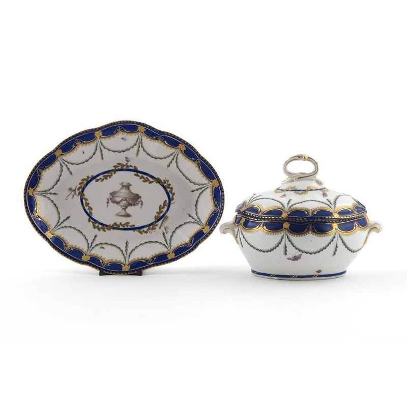A good Chelsea-Derby sauce tureen, cover and stand c.1775, the stand painted with a central Classical urn, the tureen and cover with scattered colourful butterflies, all beneath garrya swags and blue and gilt borders, gilt D and anchor marks, 23cm. (3)