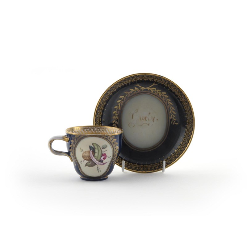 An Ansbach teacup and saucer c.1780, decorated in The Hague with a floral G monogram to one side, the reverse with a vignette of a walnut and bean pods, the saucer inscribed 'Gurly', A marks, 13.1cm. (2)