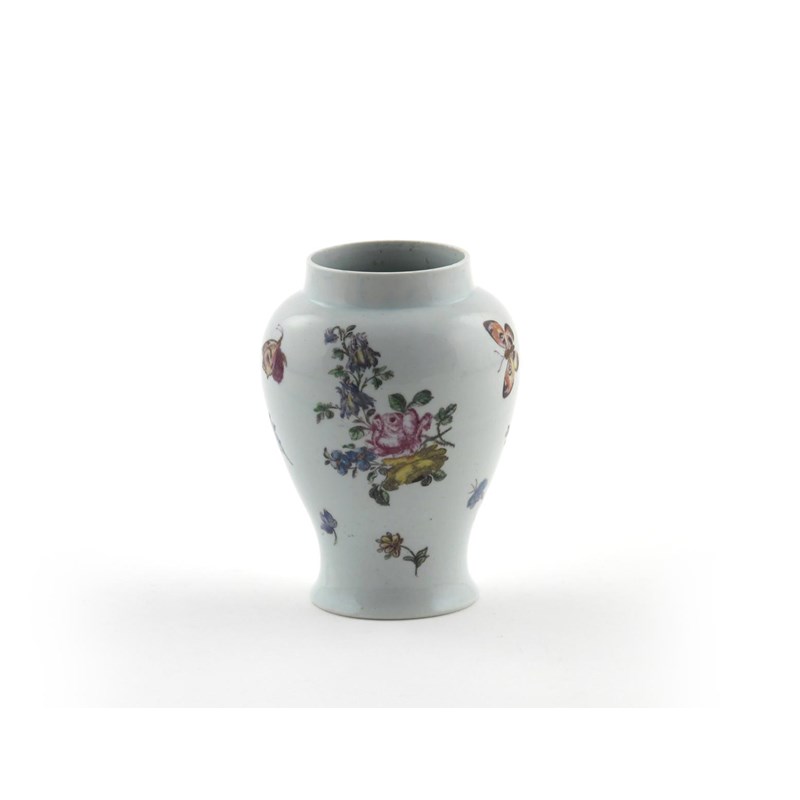 A good Vauxhall vase c.1760, decorated with polychrome flowers and scattered butterflies in fine detail, 11.8cm.