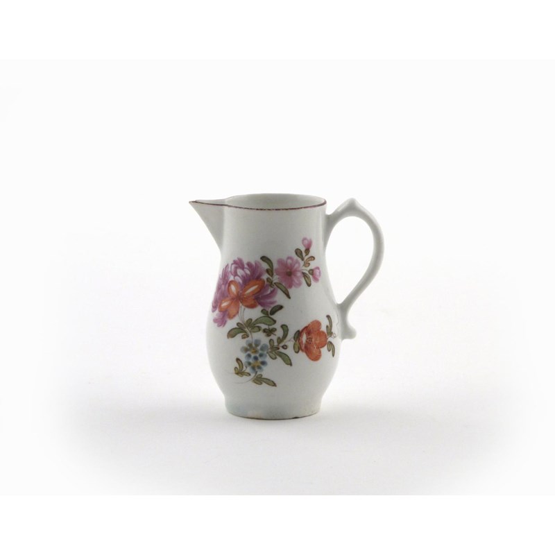 A Lowestoft sparrow beak jug c.1775, the narrow body brightly painted with flowers, brown line rim, tiny chip to the spout, 8.5cm.