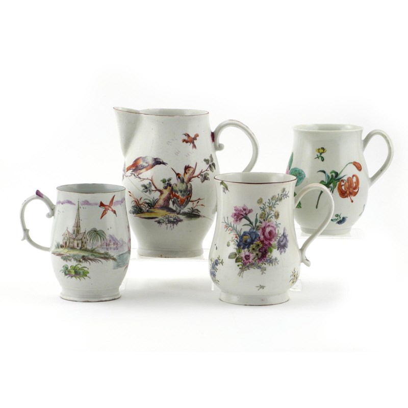 Three large English porcelain mugs 2nd half 18th century, one Longton Hall decorated by the 'Castle' painter with a church and harbour scene and two large exotic birds, one Chelsea painted with flower sprays, one Worcester painted with large botanical blooms, and a large Derby jug painted with birds perched on branches, damages and restoration, 17cm max. (4)