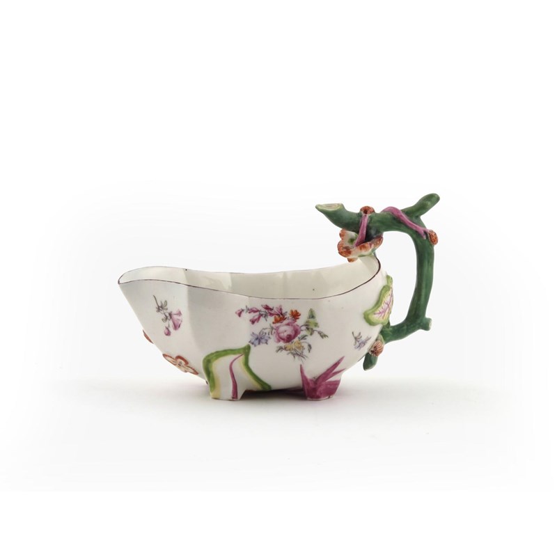 A Chelsea strawberry leaf sauceboat c.1755, the twig handle entwined with small fruits and flowers, painted to the exterior and interior with scattered blooms, brown line rim, red anchor mark, a little good restoration, 17cm.