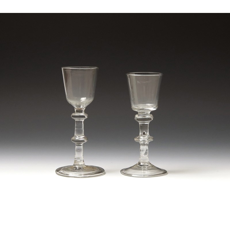 Two wine glasses c.1745, one with a bucket bowl, the other a slight ogee bowl, raised on plain double knopped stems above folded feet, 15.5cm. (2)