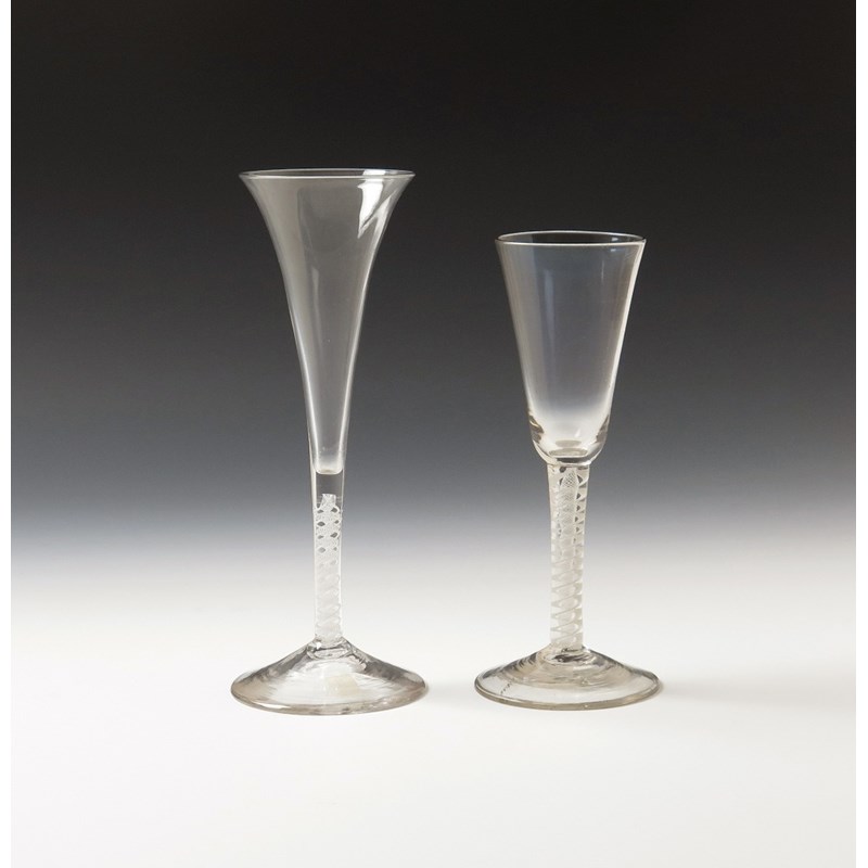 An ale glass and a wine flute c.1765, the ale with narrow funnel bowl, the flute with a long and slender drawn trumpet bowl, both raised on multiple series opaque twist stems above conical feet, 19.6cm max. (2)