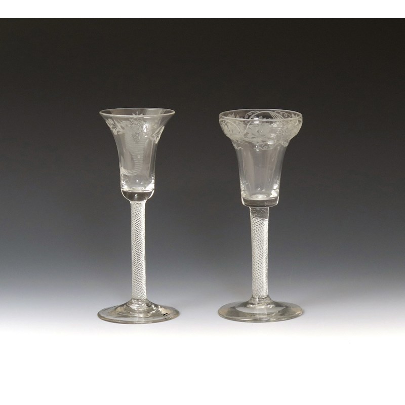 Two wine glasses c.1765, one with a pan-topped bowl engraved with a continuous band of fruiting vine with polished bunches of grapes, the other with a slender bowl engraved with a cornucopia, and with a bird in flight, both on airtwist stems, 16cm max. (2)
