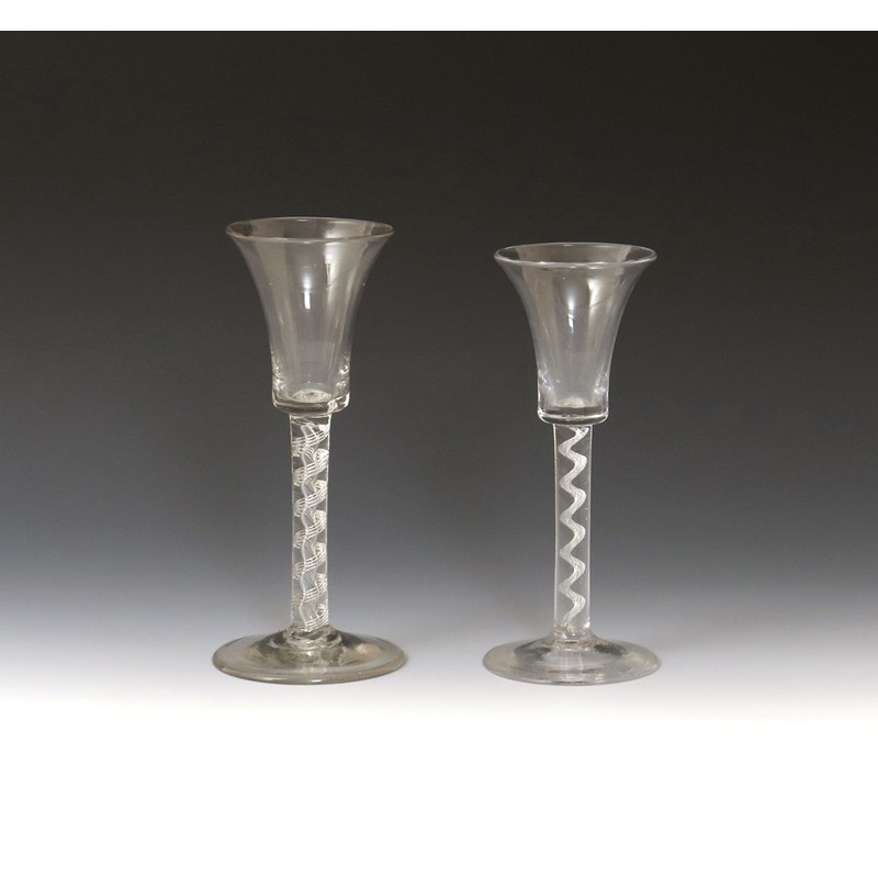 Two wine glasses c.1760, with waisted bucket bowls, one raised on a cable airtwist stem, the other on a double series airtwist with three line spiral around a spiralling tear, 17cm max. (2)