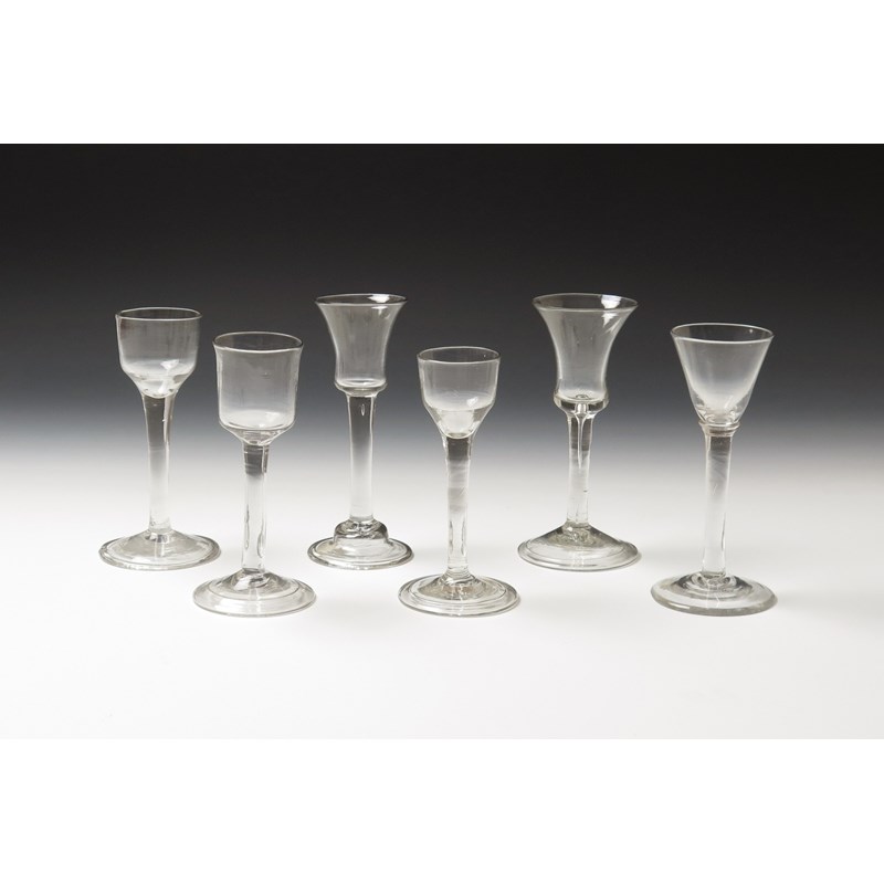 Six wine glasses mid 18th century, with bell, bucket, ogee and funnel bowls raised on plain stems, two with tear inclusions, the funnel with a moulded collar to the top of the stem, one bell bowl raised on a domed and folded foot, 16cm max. (6)