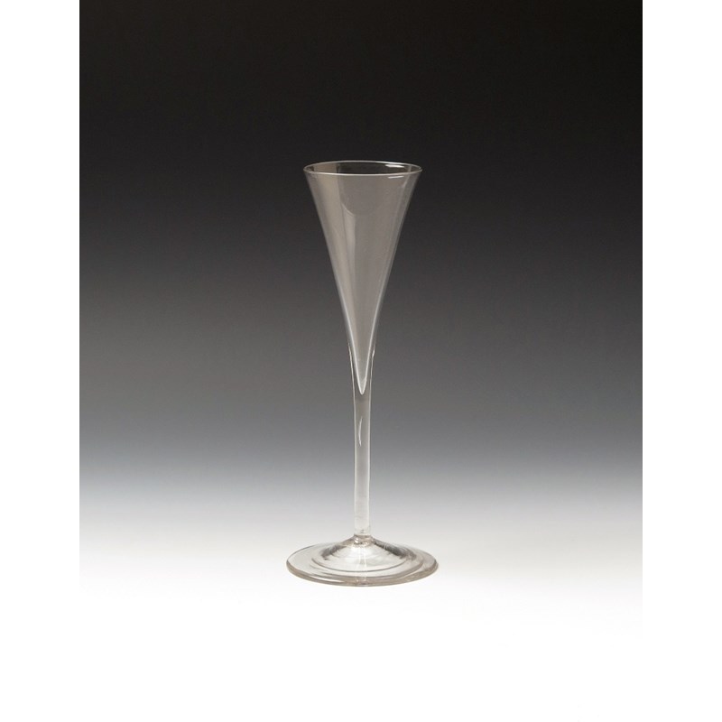 A toasting glass c.1750, with a slender drawn trumpet bowl above a fine plain stem and conical foot, 19.5cm.