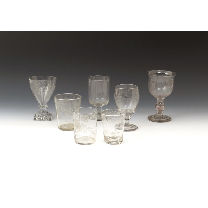 Three rummers and three beakers 18th/19th century, one rummer engraved with the monogram 'GCR' and 'Semper Fidelis 13th August 1789', another with a simple foliate spray and star design, one tumbler dated 1777 and engraved with a rose and butterfly, and a coin glass with wide lipped bowl, the hollow-knopped stem containing a small coin, 15.5cm max. (7)