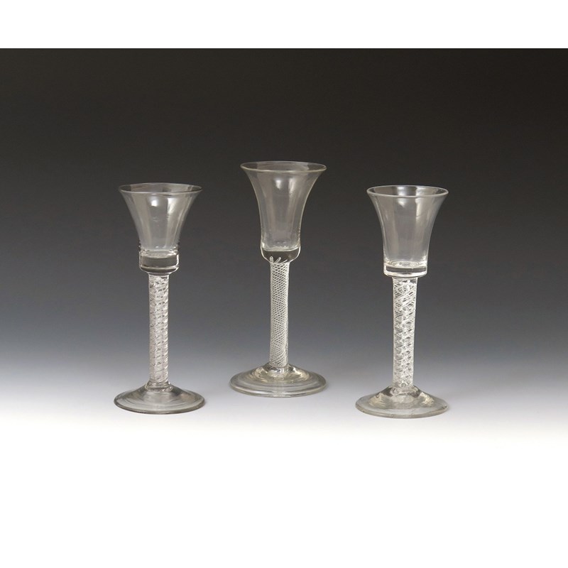Three wine glasses mid 18th century, two with waisted bucket bowls raised on dense double series airtwist stems, the last a bell bowl on a multi-spiral airtwist above a folded foot, 17.3cm max. (3)