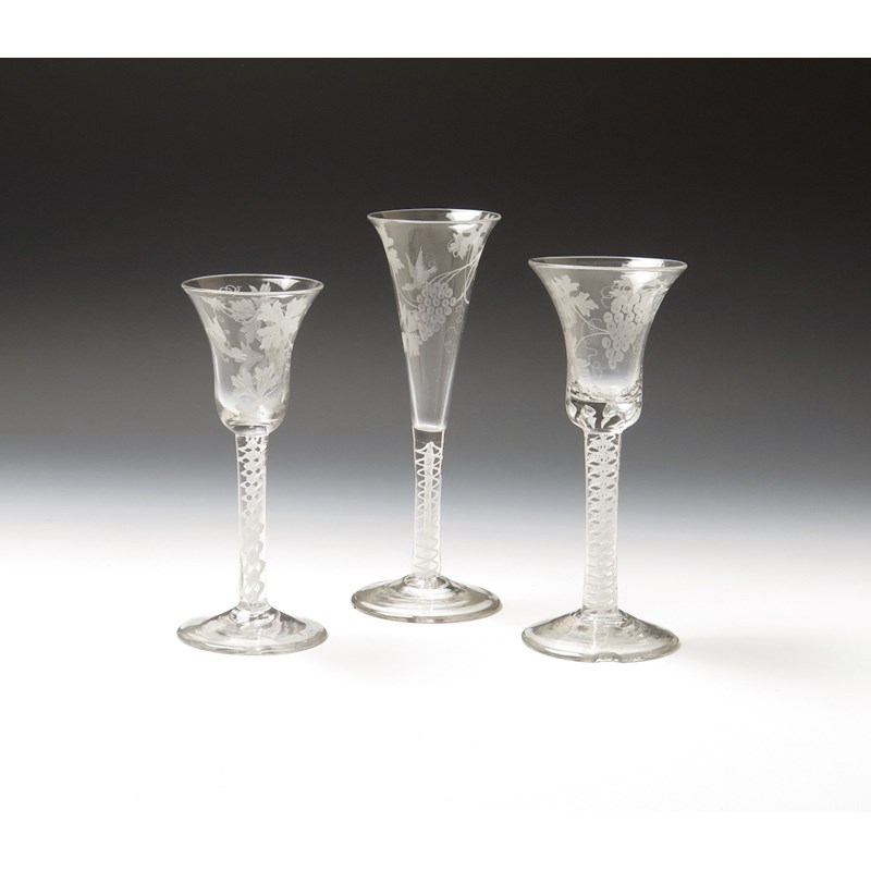 Three wine glasses c.1760, all engraved with fruiting grapevine and a small bird in flight, one with a bell-shaped bowl raised on a composite stem with two rows of tears above a multiple series opaque twist foot, the others raised on differing double series opaque twist stems, some footrim chips, 19.7cm max. (3)
