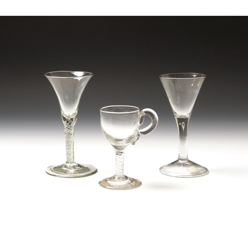 Three wine glasses mid 18th century, one with rounded bowl and applied handle above an opaque twist stem, one with a bell bowl raised on an airtwist stem, the last with a drawn trumpet bowl on a plain stem with tear inclusion above a conical folded foot, some damages, 16.5cm max. (3)