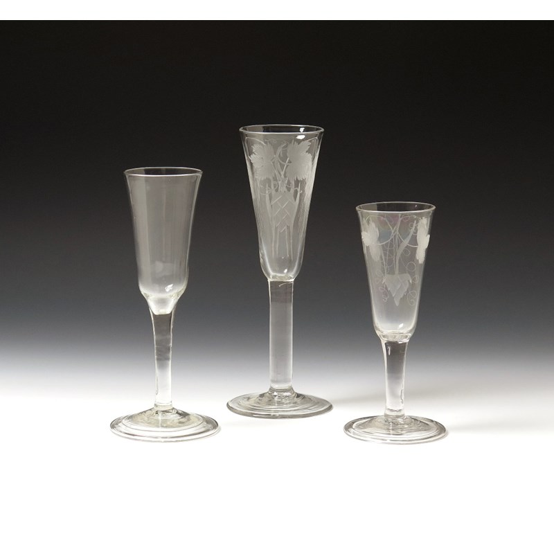 Three ale glasses c.1750-60, with rounded funnel bowls, two engraved with hops and barley, all raised on plain stems, two above folded feet, 20.8cm max. (3)