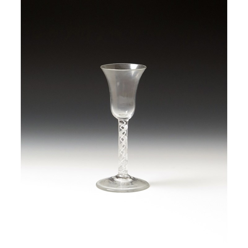 A mixed twist wine glass c.1765, with a narrow bell bowl, raised on a stem of entwining opaque and air twists, 15.2cm.