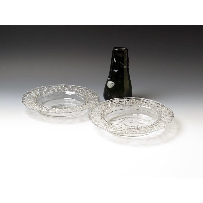 A small glass vase of Wrockwardine/Nailsea type early 19th century, the tapering form of a deep green colour with swirls and splashes of white, and a pair of Liege openwork glass basket stands or dishes, 22cm max. (3)