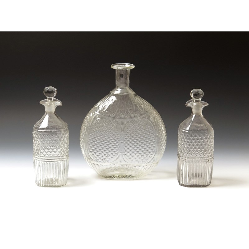 A pair of moulded decanters and stoppers c.1800, the square forms moulded with a wide diamond panel above vertical bands, and an unusual moulded flask of flattened circular shape, with panels of diamond moulding beneath a band of leaves, 24.7cm max. (5)