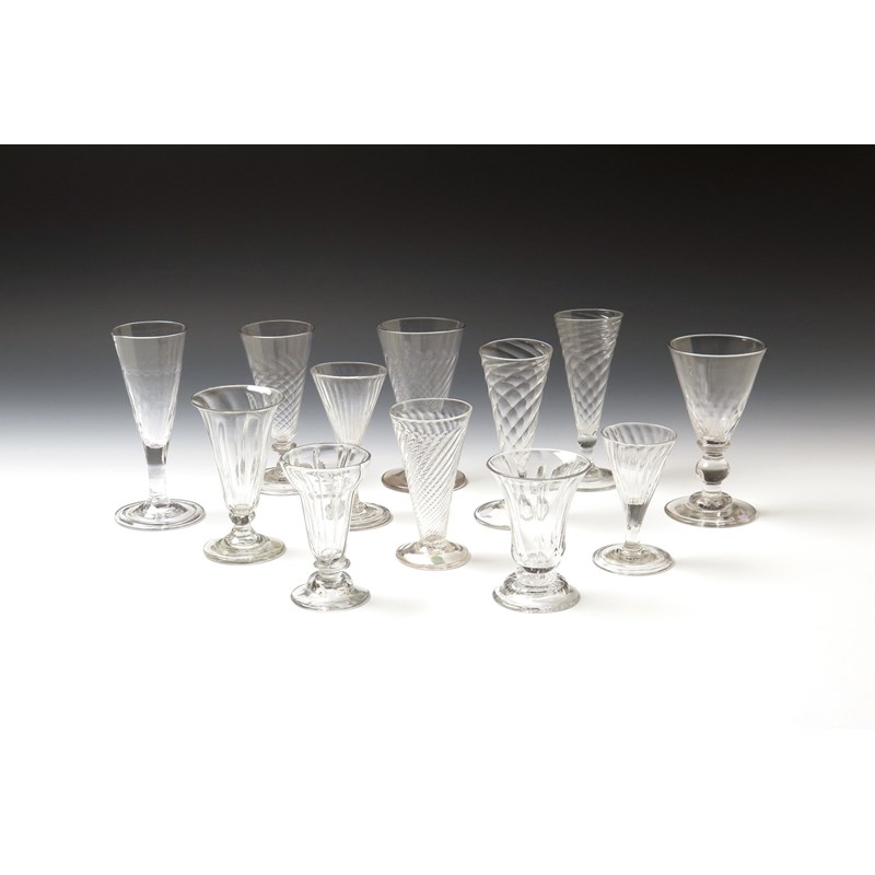 Twelve moulded glasses most 18th century, for ale, jelly and wine, most with drawn trumpet bowls with spiral moulding, ribs or honeycomb designs, on conical and folded feet, 12.4cm max. (12)
