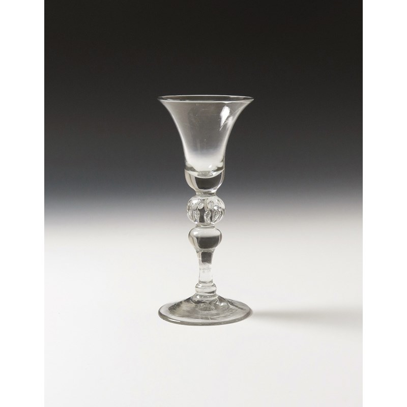 A baluster wine glass c.1730, the bell bowl raised on a tall baluster stem with teared knop containing two rows of air beads, with small basal knop above a conical foot, 16.8cm.