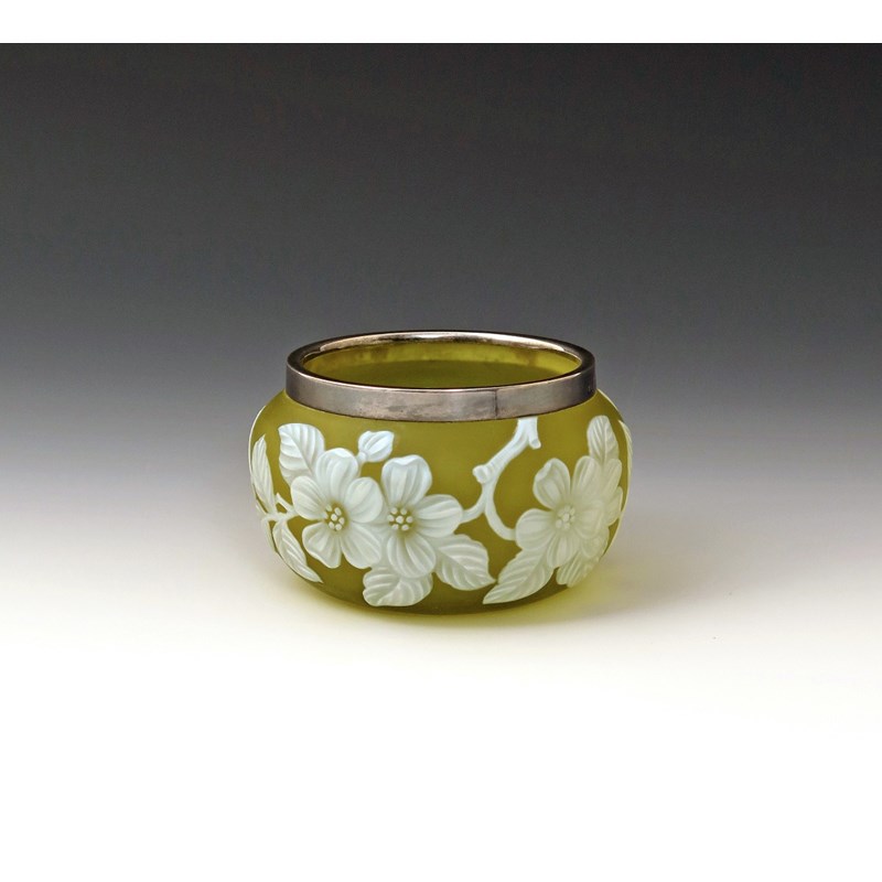 A Thomas Webb & Sons (Stourbridge) cameo glass bowl c.1887, finely cut in white with a large spray of flowering blossom against a yellow ground, silver mount to the rim, hallmarks for London 1887, maker's mark for Cornelius Saunders and Francis Shepherd, 7cm high.
